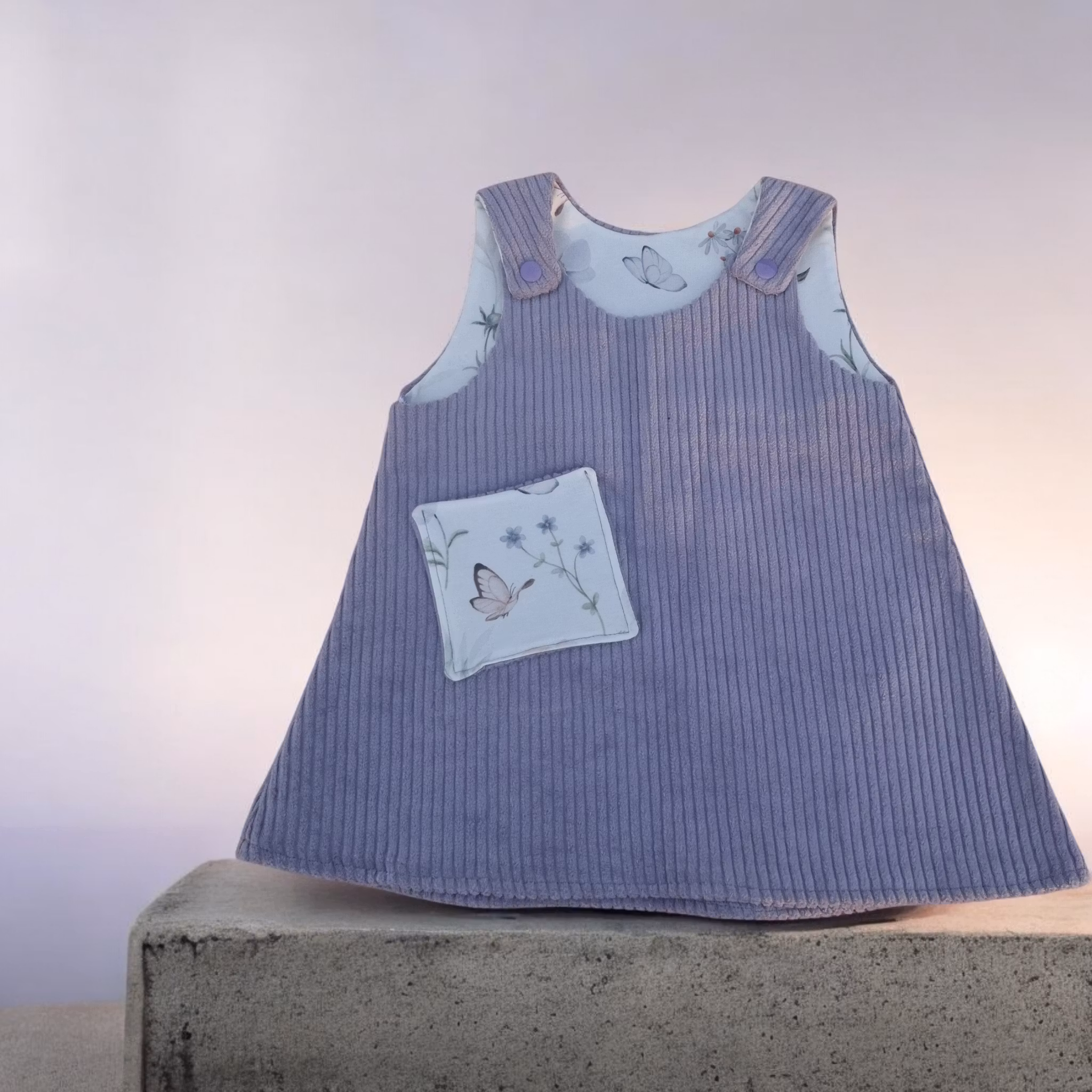 Denne er sydd av myk, god og holdbar kordfløyel av høy kvalitet, som gir både komfort og stil. Kjolen er foret med myk jersey for ekstra behagelighet. Den lukkes enkelt med trykknapper på skuldrene, og har en praktisk lomme foran.