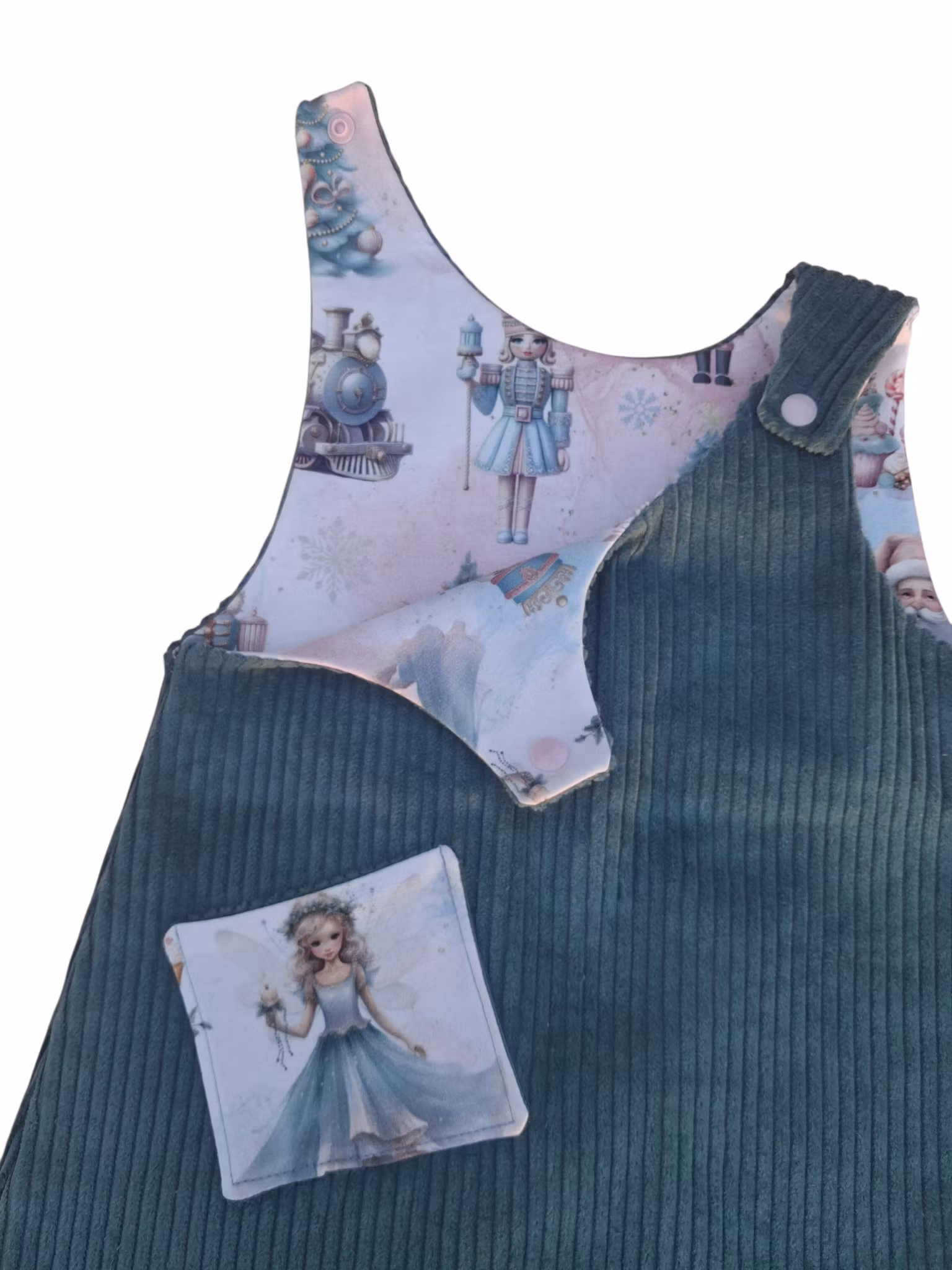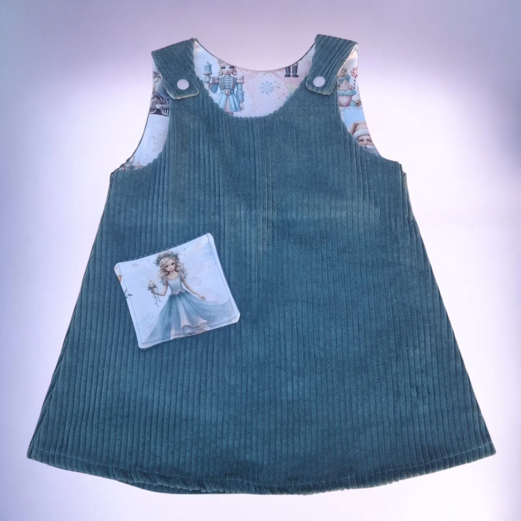 Denne  er sydd av myk, god og holdbar kordfløyel av høy kvalitet, som gir både komfort og stil. Kjolen er foret med myk jersey  for ekstra behagelighet. Den lukkes enkelt med trykknapper på skuldrene, og har en praktisk lomme foran.