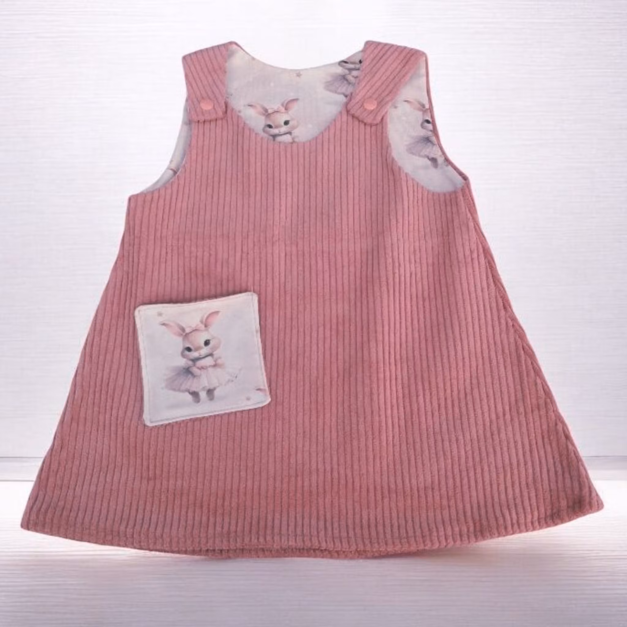 Denne  er sydd av myk, god og holdbar kordfløyel av høy kvalitet, som gir både komfort og stil. Kjolen er foret med myk jersey  for ekstra behagelighet. Den lukkes enkelt med trykknapper på skuldrene, og har en praktisk lomme foran.